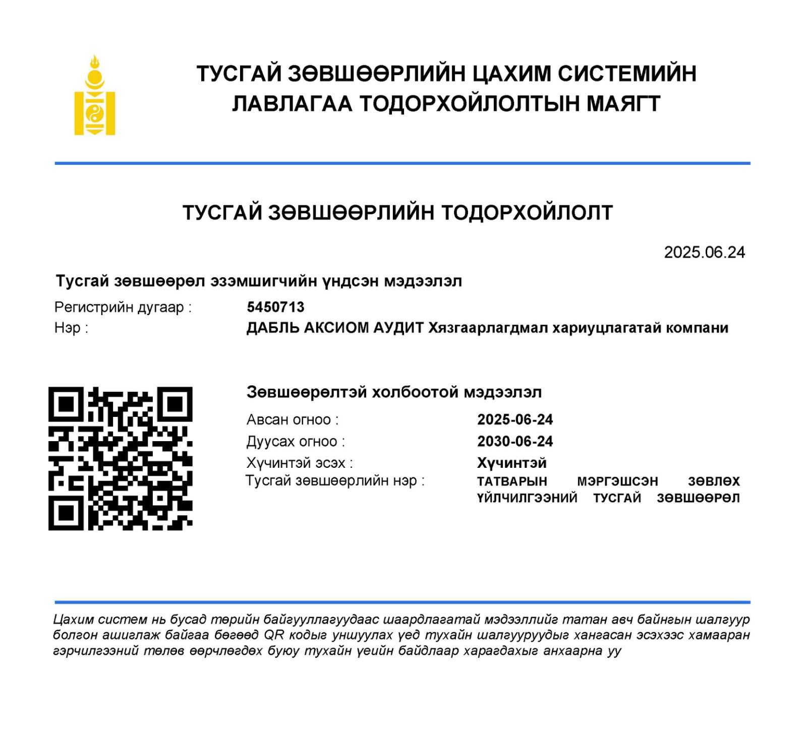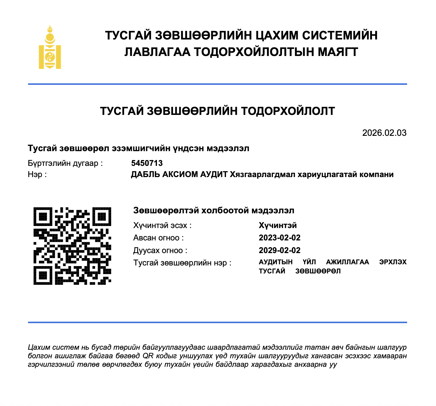 "Дабль Аксиом Аудит" ХХК-аар үйлчлүүлж, хамтарч ажиллаж байгаа, цаашид хамтран ажиллахыг хүсч буй аж ахуйн нэгж, иргэд, нийт үйлдвэрлэл, үйлчилгээ эрхлэгч та бүхний амар амгаланг айлтган мэндчилье.